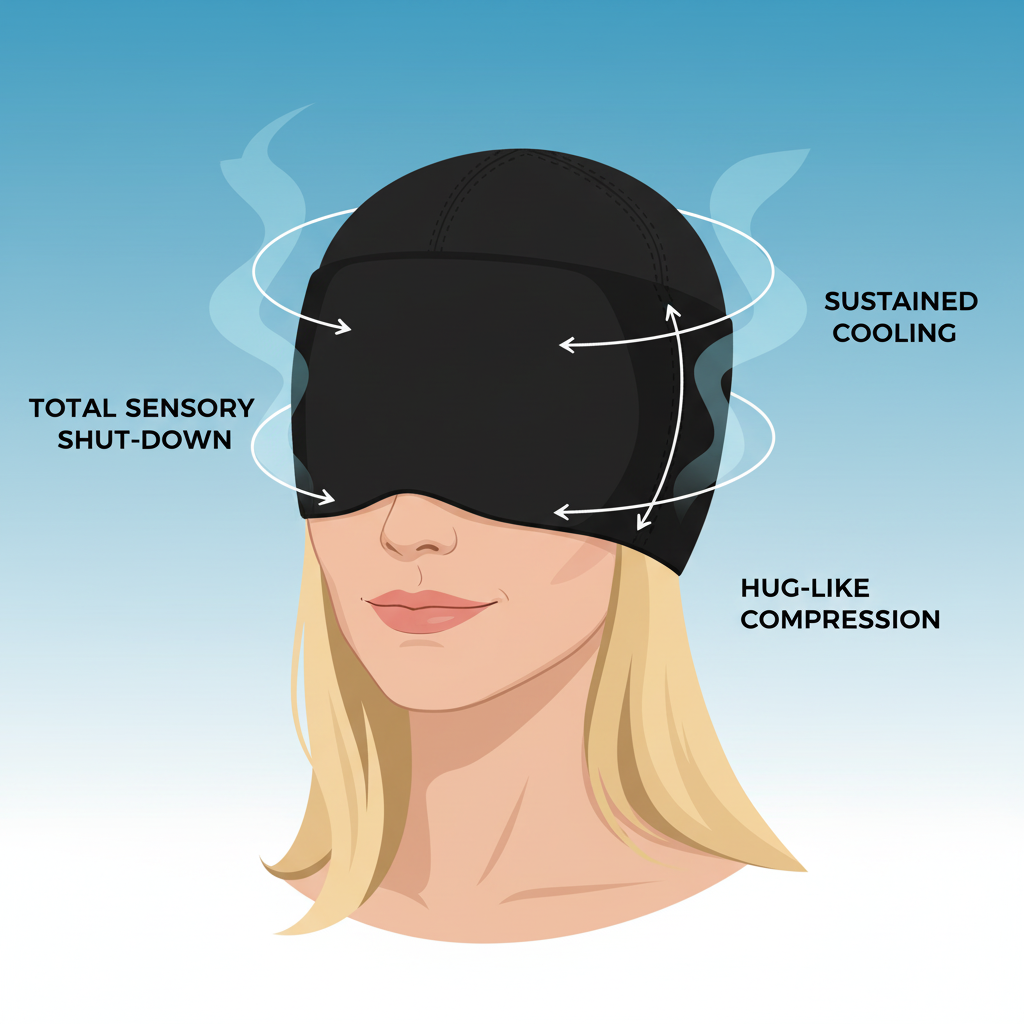 Severe attacks cause sensory overload, forcing sufferers to "completely drown out all noises and lights". This cap instantly pulls down to act as a blackout mask and provides the cold pressure needed to enforce rest. It gives you a sense of peace and is the immediate sanctuary your body requires to combat light sensitivity and noise.