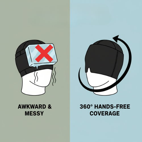 Traditional ice packs are rigid, drip, and offer minimal coverage. Our cap provides 360° coverage and applies continuous, gentle mechanical compression. This makes it a multi-functional therapeutic tool, superior to single-modality treatments.